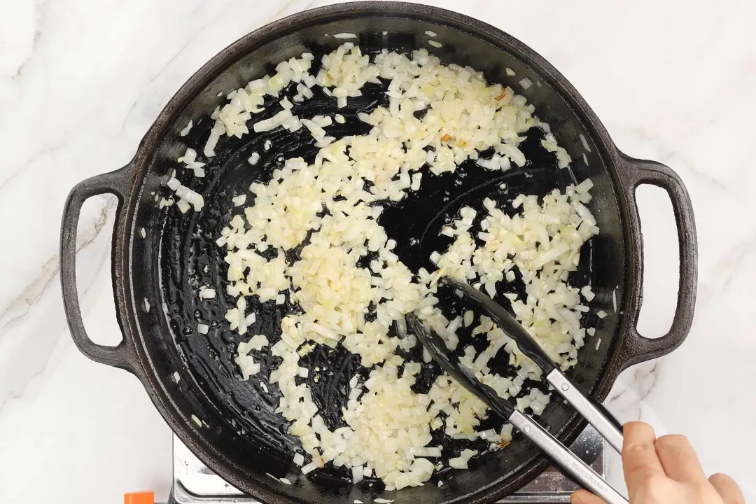 Heat 1 1/2 tbsp olive oil in a large skillet over medium heat. Add 4 oz onion and 1 tbsp garlic and stir fry until fragrant, 1 minute.