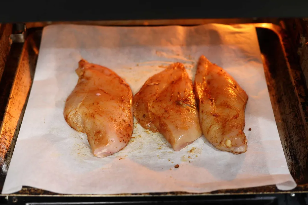 Season the chicken: Place 18 oz skinless boneless chicken breast on a parchment-lined sheet. Add 1/2 tsp paprika, 1/2 tsp garlic powder, and 1/2 tsp Cajun seasoning and rub with the meat to coat evenly.