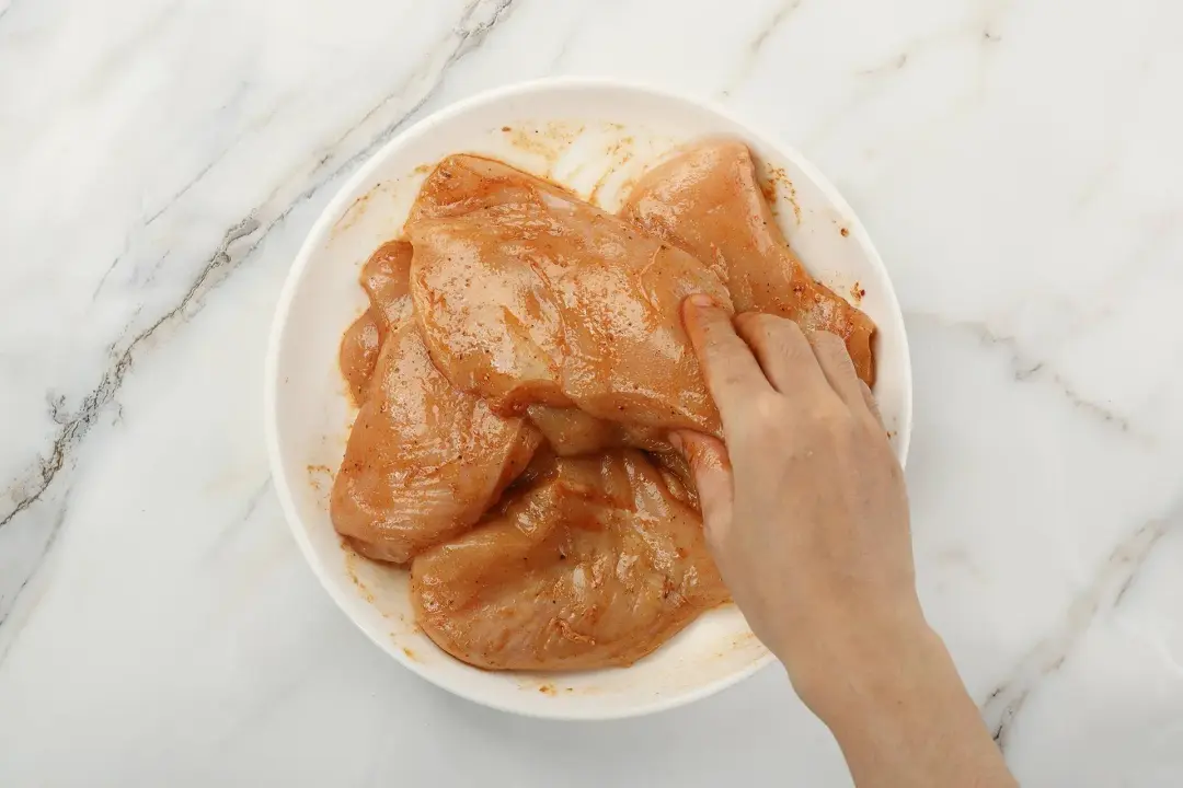 Place the meat into a bowl along with 2 tbsp olive oil, 1 tsp lemon juice, 1/2 tsp paprika, 1/2 tsp garlic powder, 1/2 tsp salt, and 1/4 tsp pepper. Mix well and set aside.