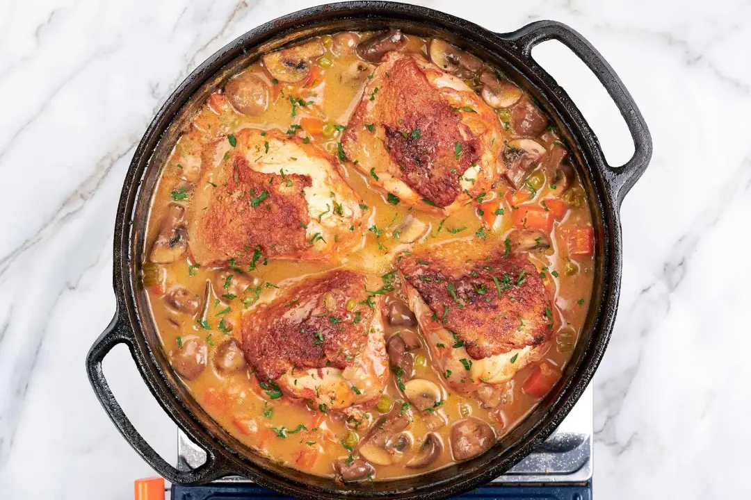 This chicken fricassee recipe gives you a pan of saucy chicken thighs with tender, flavorful vegetables. It takes only 20 minutes to prep and 25 minutes of hands-free time, something to fit in your tight schedule.