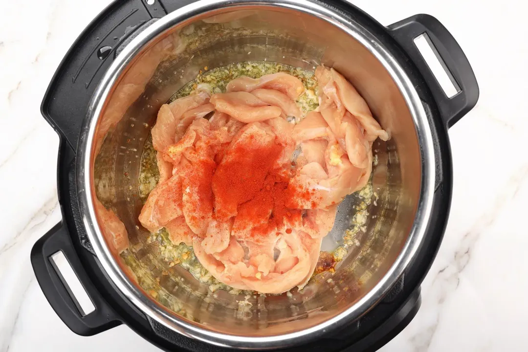 Add 16 oz skinless boneless chicken breast and 1/2 tsp paprika. Stir for 2 minutes.