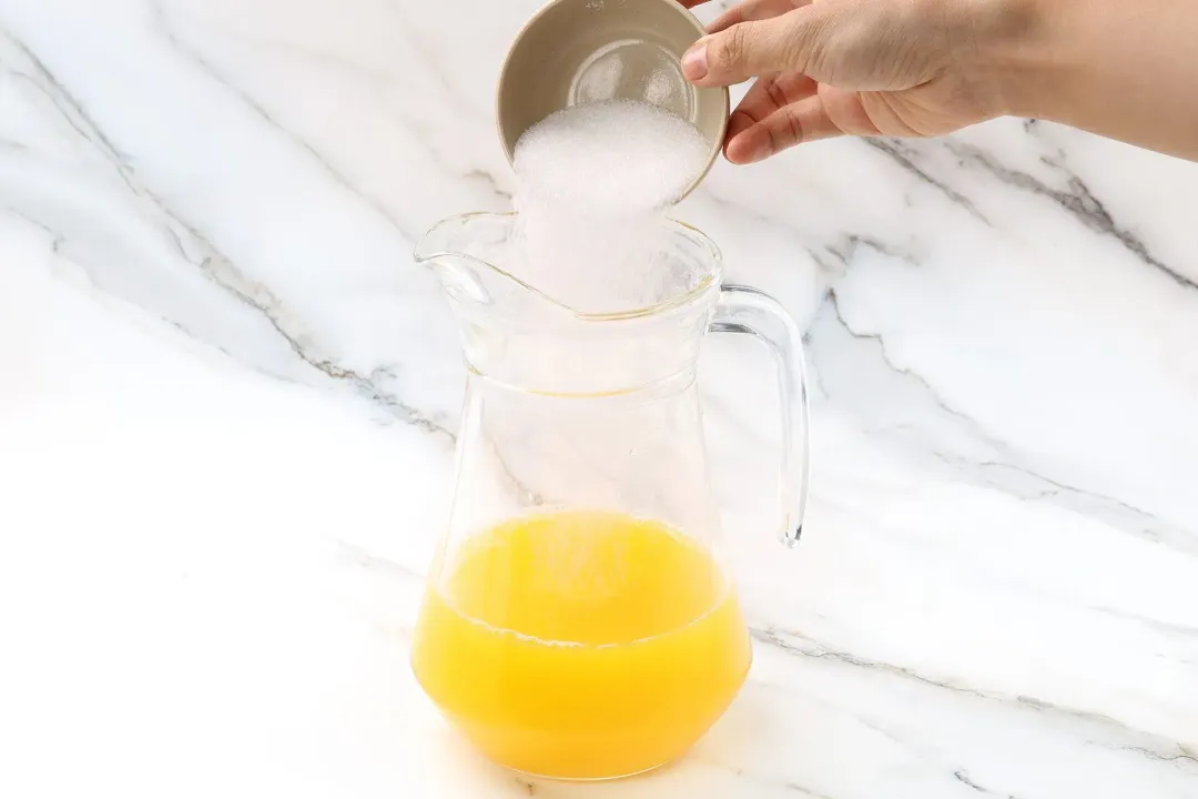 In a pitcher, stir sugar to your taste (maximum 8 tsp) with 1 1/2 cups orange juice until the sugar is dissolved.
