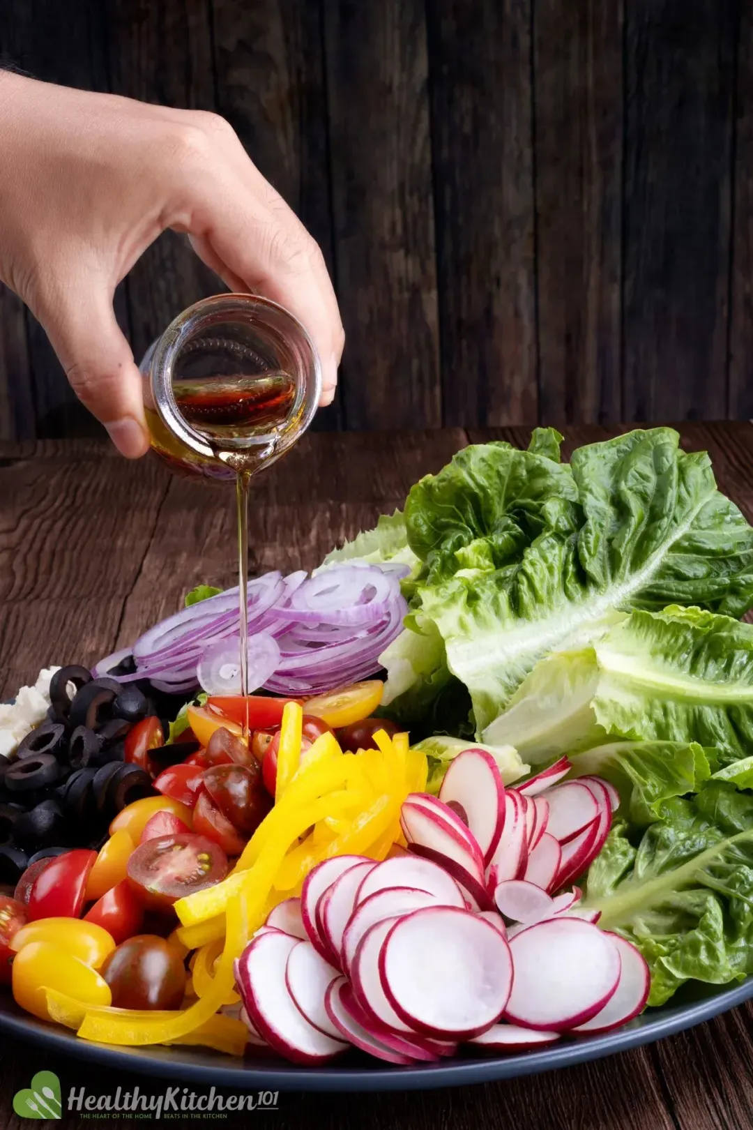 Greek salad, the original version, uses only salt, black pepper, and olive oil for its dressing. We thought it’s not as flavorful as it could be, so we added red wine vinegar.
