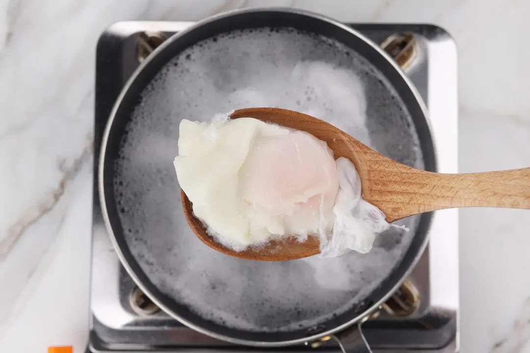 Poach the eggs: In a small pot, pour in 3 cups water and 2 tbsp white vinegar and bring the mixture to a gentle simmer. Crack 4 medium egg into a small shallow bowl. Using a slotted spoon, swirl the water and slide the eggs into it. Simmer for about 1 minute until the white is set and the yolk is filmed over. Using a slotted spoon, remove the poached eggs to a bowl of cool water.