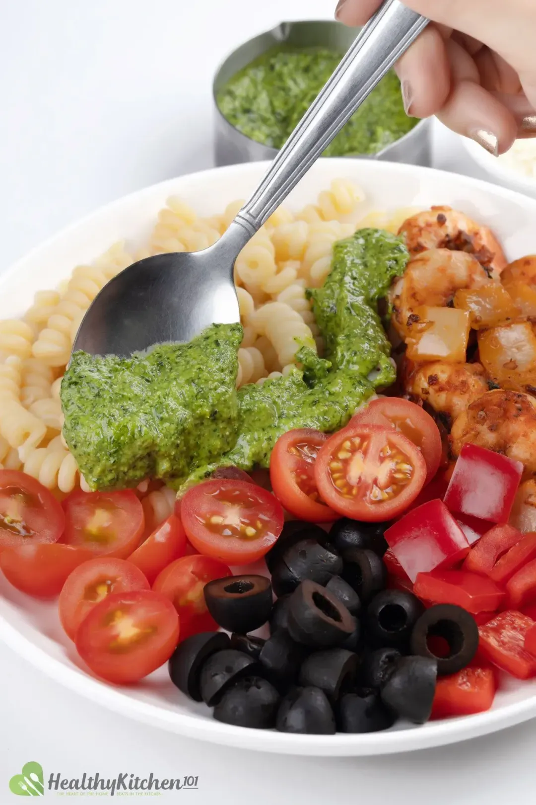 Traditional pesto contains mostly olive oil, roasted nuts, salt, and parmesan cheese. This can sometimes lead to it being high in saturated fat and sodium.