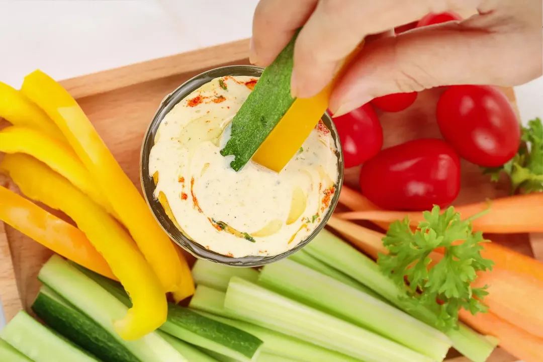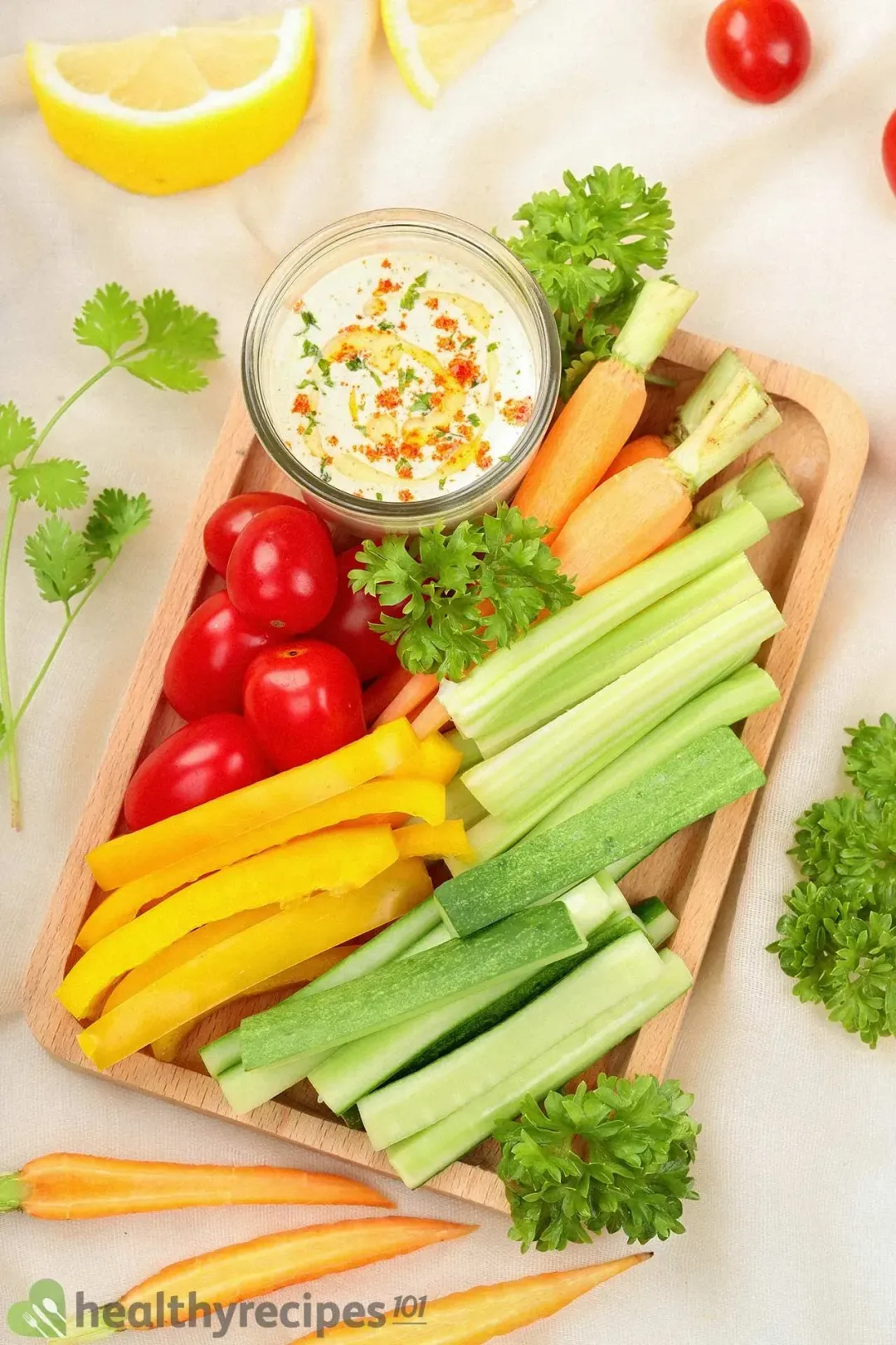 Although veggies taste amazing on their own, serving them with a creamy dip takes them to another level. Our favorites include carrots, celery, cherry tomatoes, bell peppers, and cucumbers.